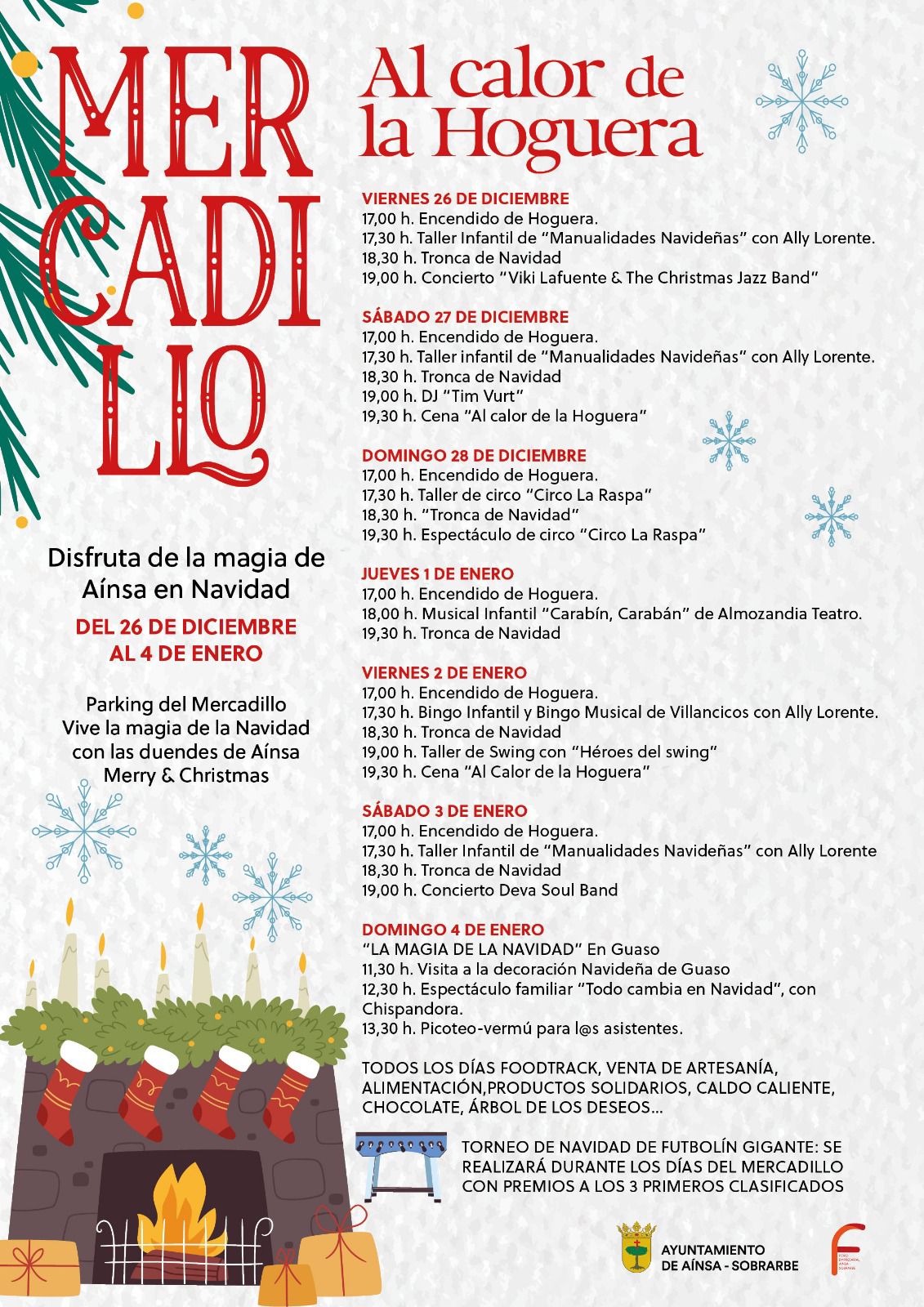 El taller de circo con ‘Circo La Raspa’ de este domingo, o el musical Carabín, Carabán de Almozandía Teatro el jueves 1 de enero, son dos de los acontecimientos que también se esperan con ganas en Aínsa. Las duendes Merry y Christmas formarán parte ineludible de la programación, así como el torneo de futbolín gigante, que tras el éxito de 2024 celebrará su segunda edición. “Tampoco faltará ningún día el árbol de los deseos, que este año será nuevo, y finalizaremos las actividades en Guaso, el 4 de enero, con la actividad de ‘La Magia de la Navidad’, a la que acudirá el Consejo de Infancia y Adolescencia por tercer año consecutivo”, concluye la concejala. “Agradecemos al comité organizador del Mercadillo, la implicación de las personas del municipio nos ayuda a sacar adelante el trabajo y a que sea un lugar de encuentro muy especial en estas fechas tan entrañables. Todos, pequeños y mayores, disfrutamos aquí de la magia de la Navidad”.