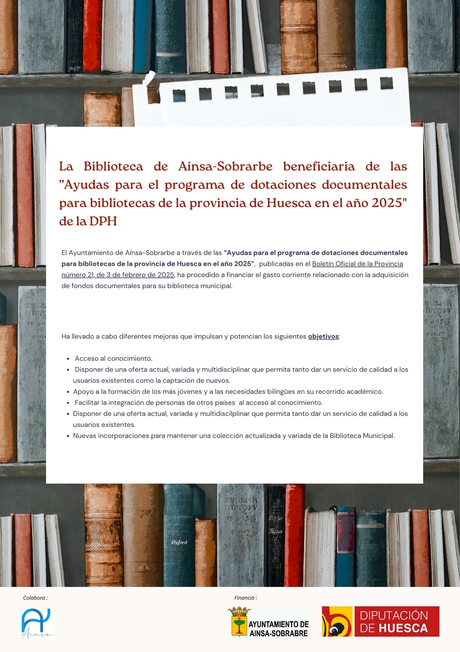 Villa de Ainsa - Sobrarbe Pirineo Actividades realizadas a traves del Plan Provincial de Concertacion Municipal de la DPHLa Biblioteca Municipal de Aínsa-Sobrarbe ha sido beneficiaria de las “Ayudas para el programa de dotaciones documentales para bibliotecas de la provincia de Huesca en el año 2025” de la Diputación Provincial de Huesca (DPH).