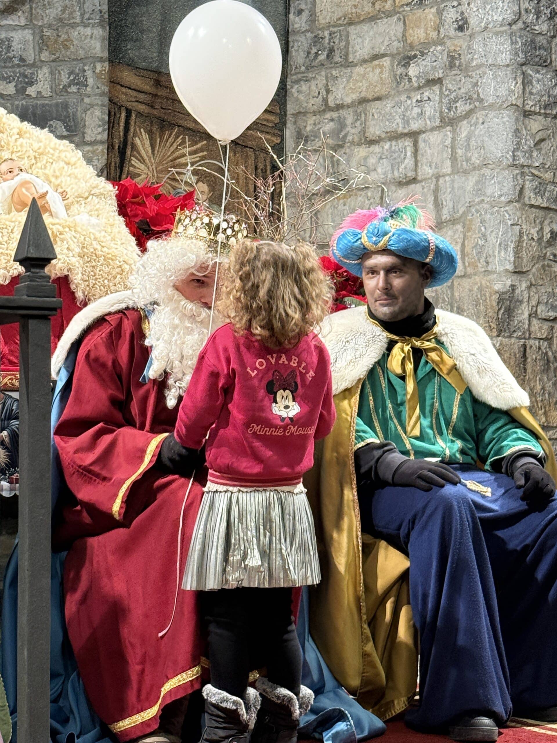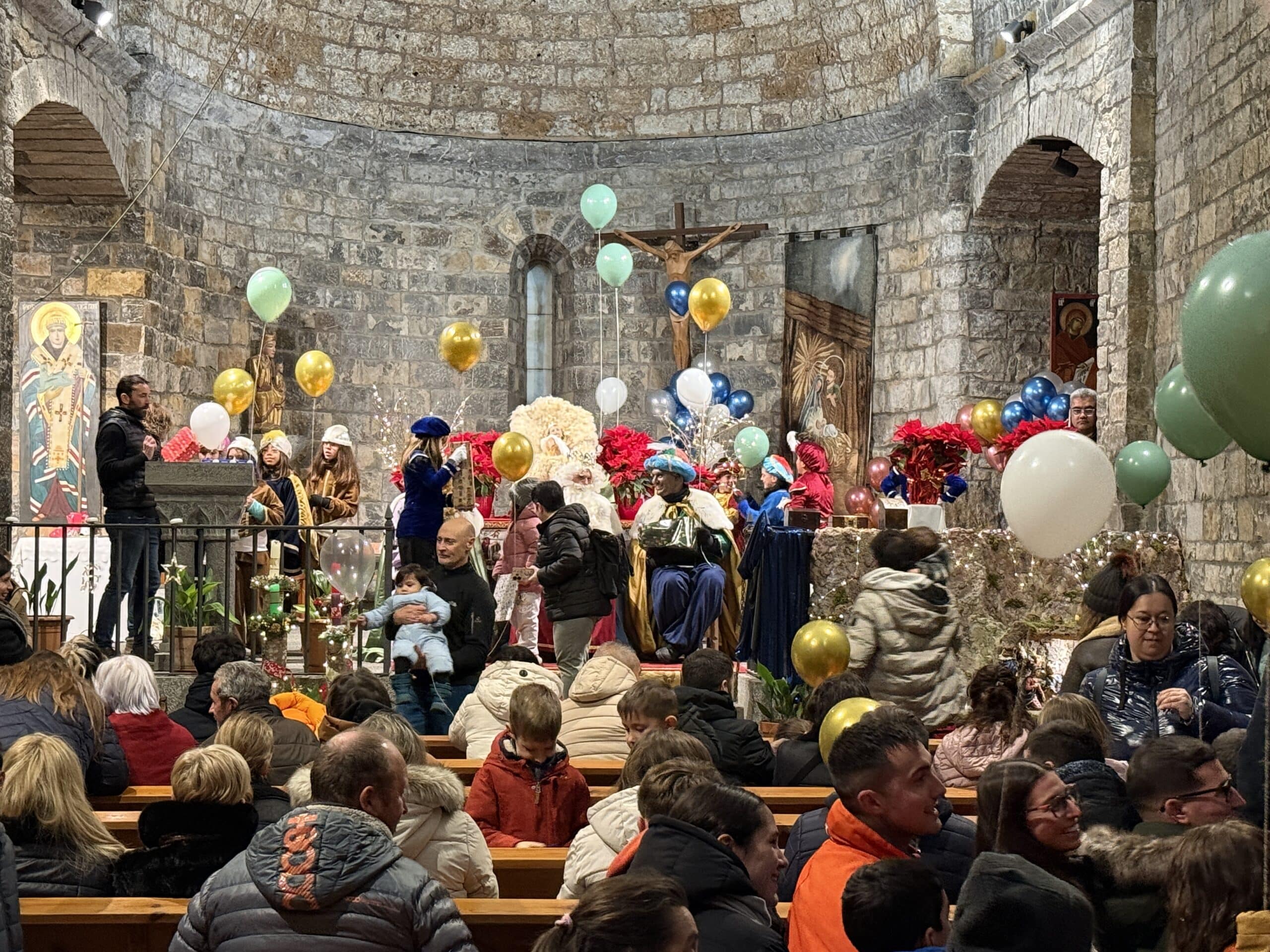 Aínsa, 5 de enero 2026.- Los Reyes Magos han despedido una Navidad sobresaliente en el municipio de Aínsa-Sobrarbe. La comitiva ha recorrido este lunes por la tarde, fiel a la cita anual, los barrios de Banastón, Partara, el cruce y el Casco Antiguo del pueblo hasta llegar a la iglesia de Santa María alrededor de las 20h, donde se ha realizado la ofrenda al niño Jesús mientras los más pequeños recibían una primera remesa de regalos. Las bajas temperaturas de la jornada no han apagado las ganas de salir a celebrar la noche más mágica del año. Desde las 18:30h las calles se llenaban de caritas llenas de ilusión, que poco después recibían saludos y caramelos de los Reyes Magos desde sus flamantes carrozas, renovadas en la edición pasada.